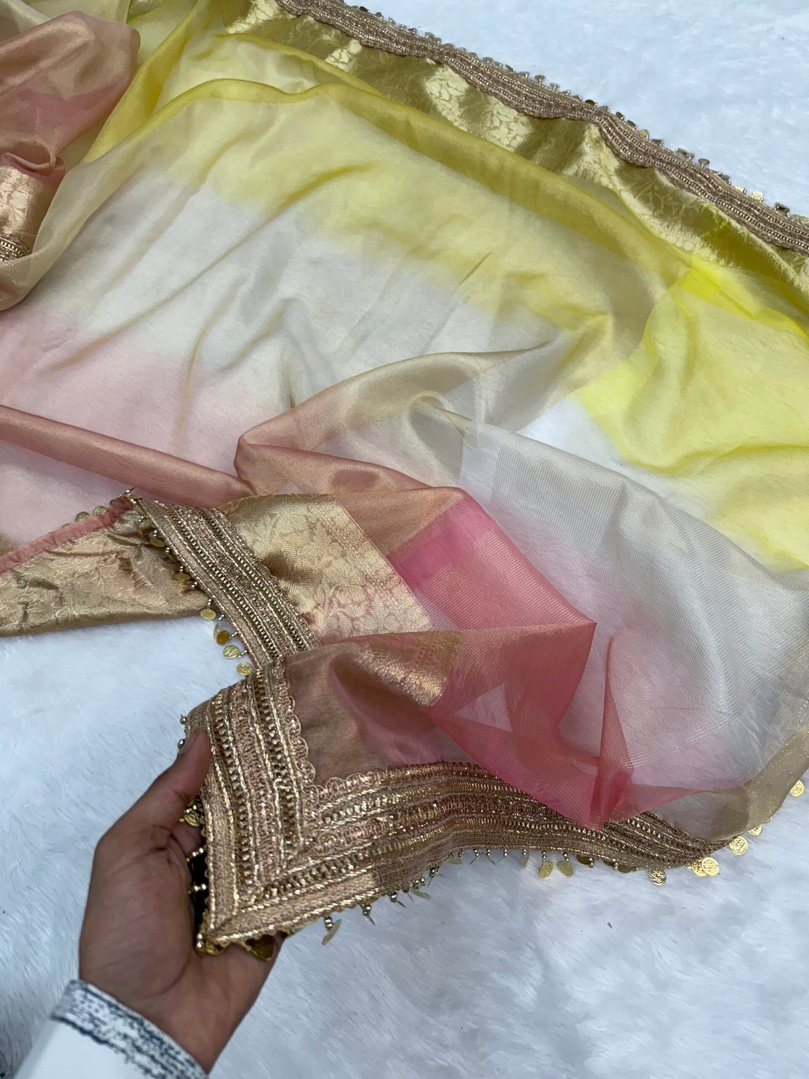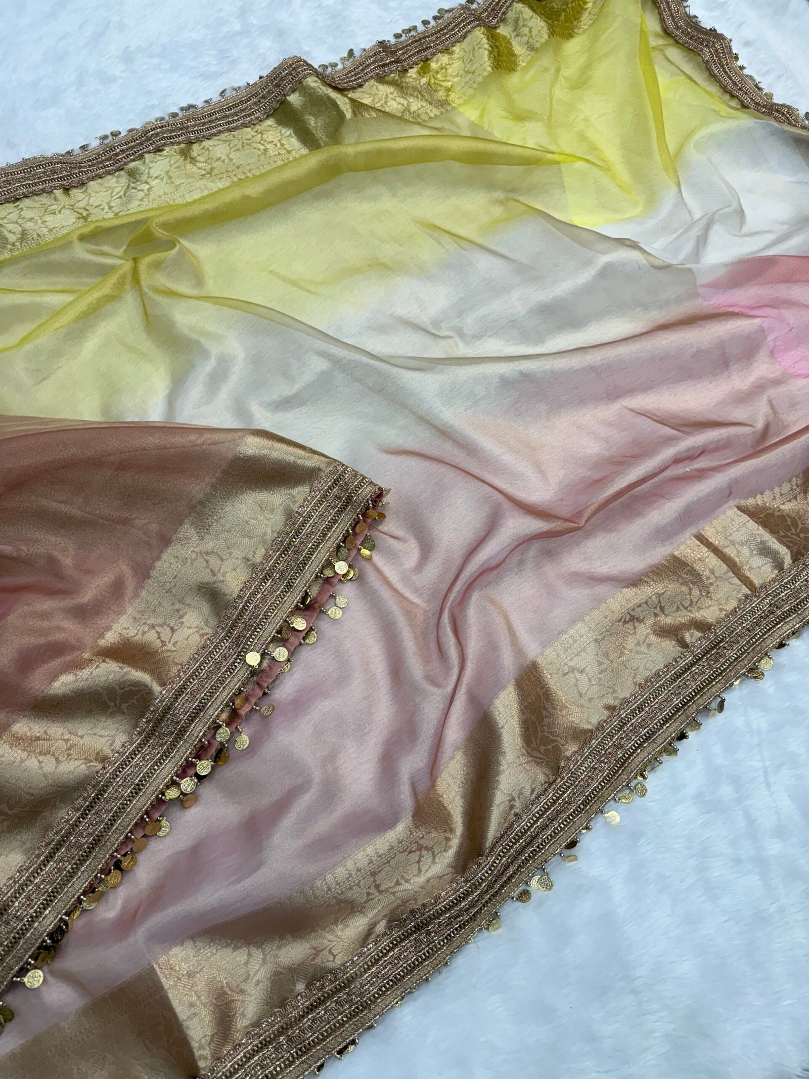 Maharani edition multi color Banarasi tissue silk saree with premium lace full body multi colour shade zari weaving Banarasi border with lace similar pallu with lace blouse with lace