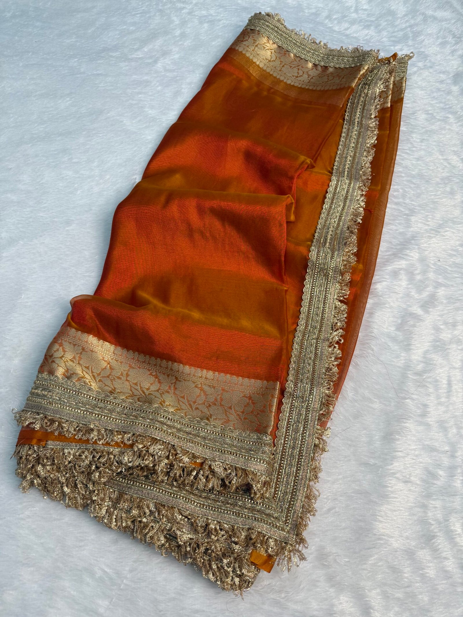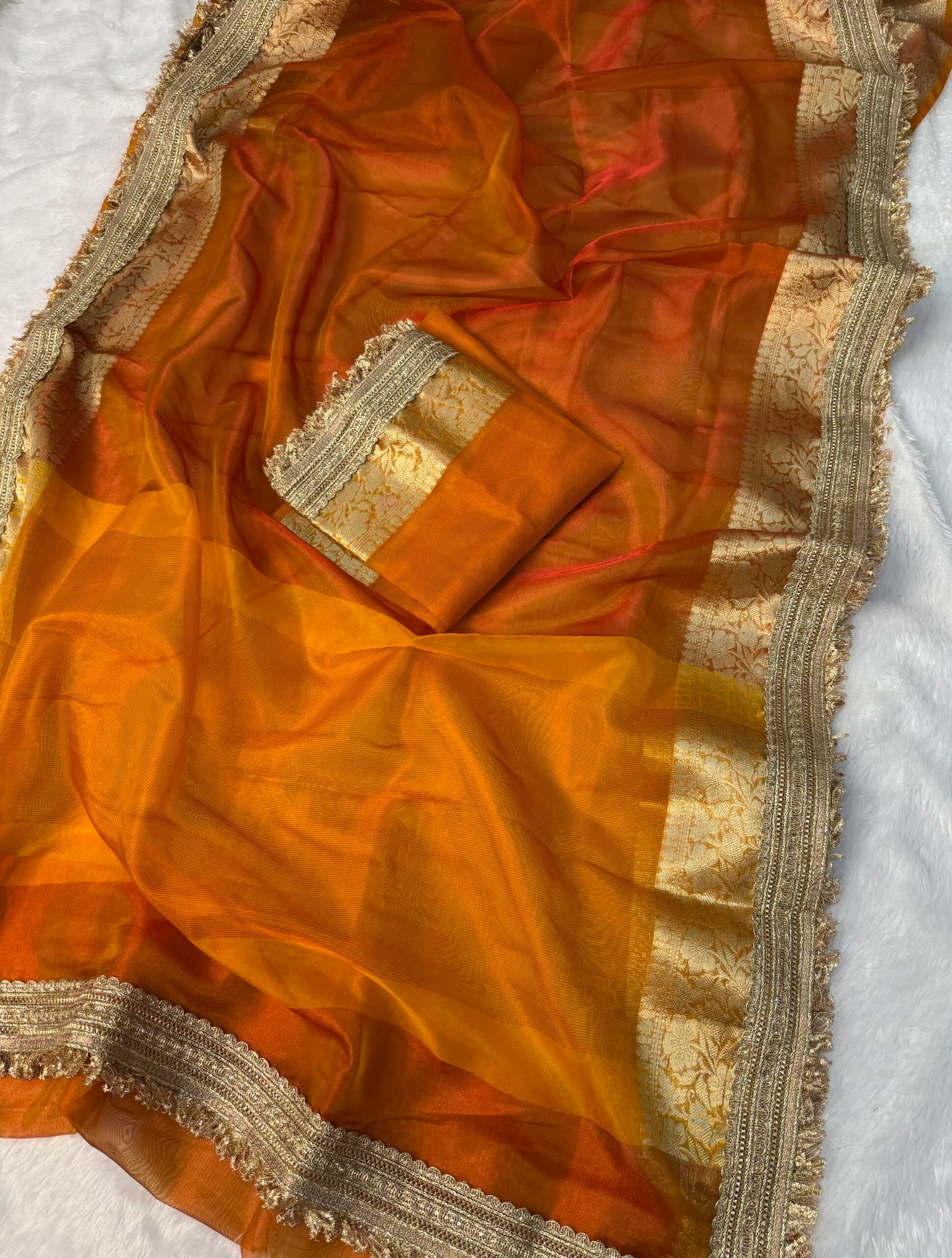 Maharani saree Banarasi soft tissue silk saree with dual color shade full body zari weaving Banarasi border with traditional pallu blouse pcs soft material saree