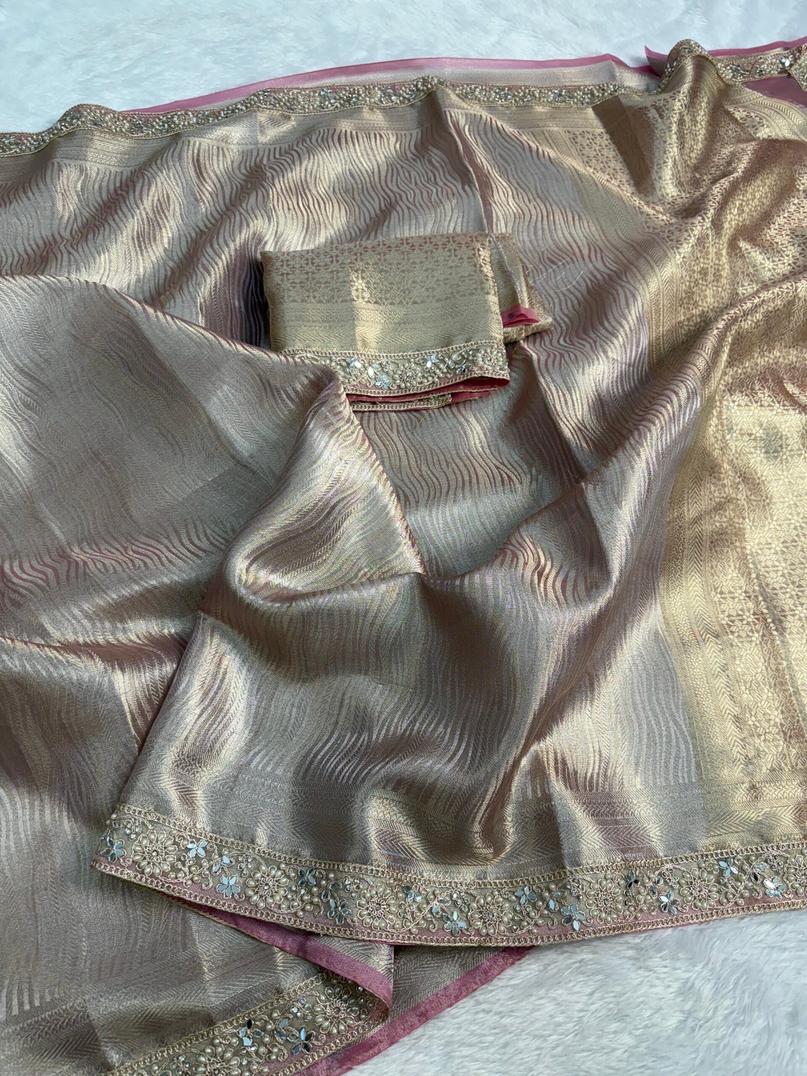 Banarasi soft tissue saree with heavy stone lace full body zigzag design soft material saree look like pure tissue zari weaving Banarasi border with lace traditional pallu with brocade blouse pcs