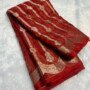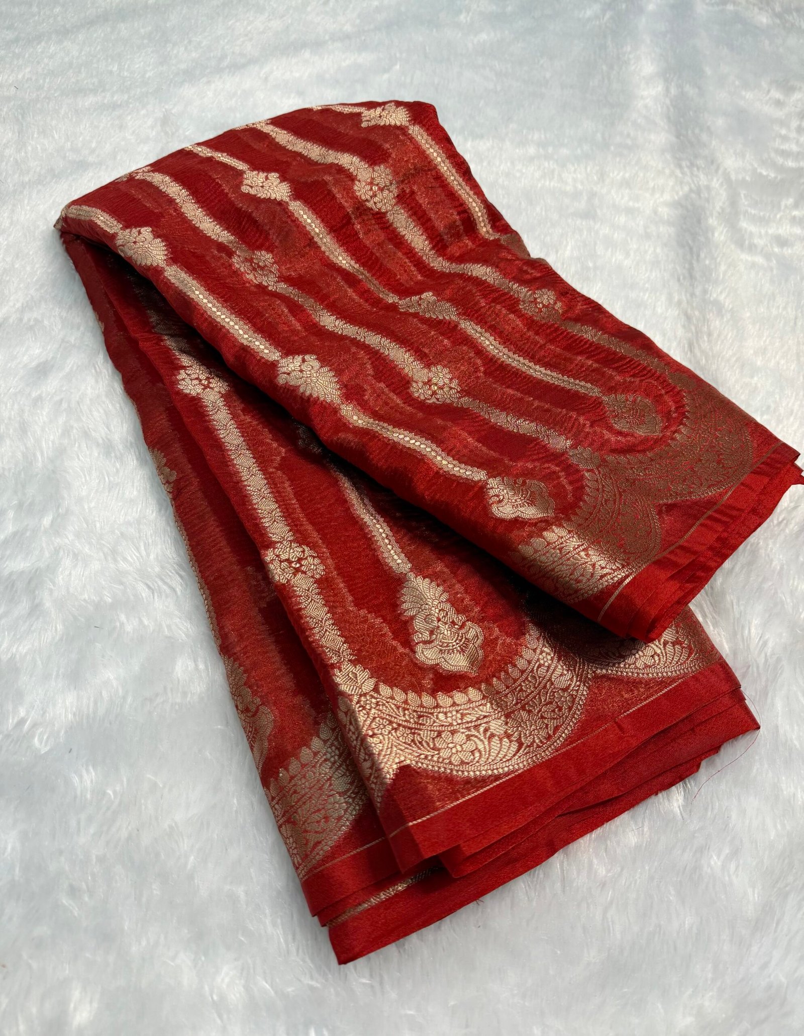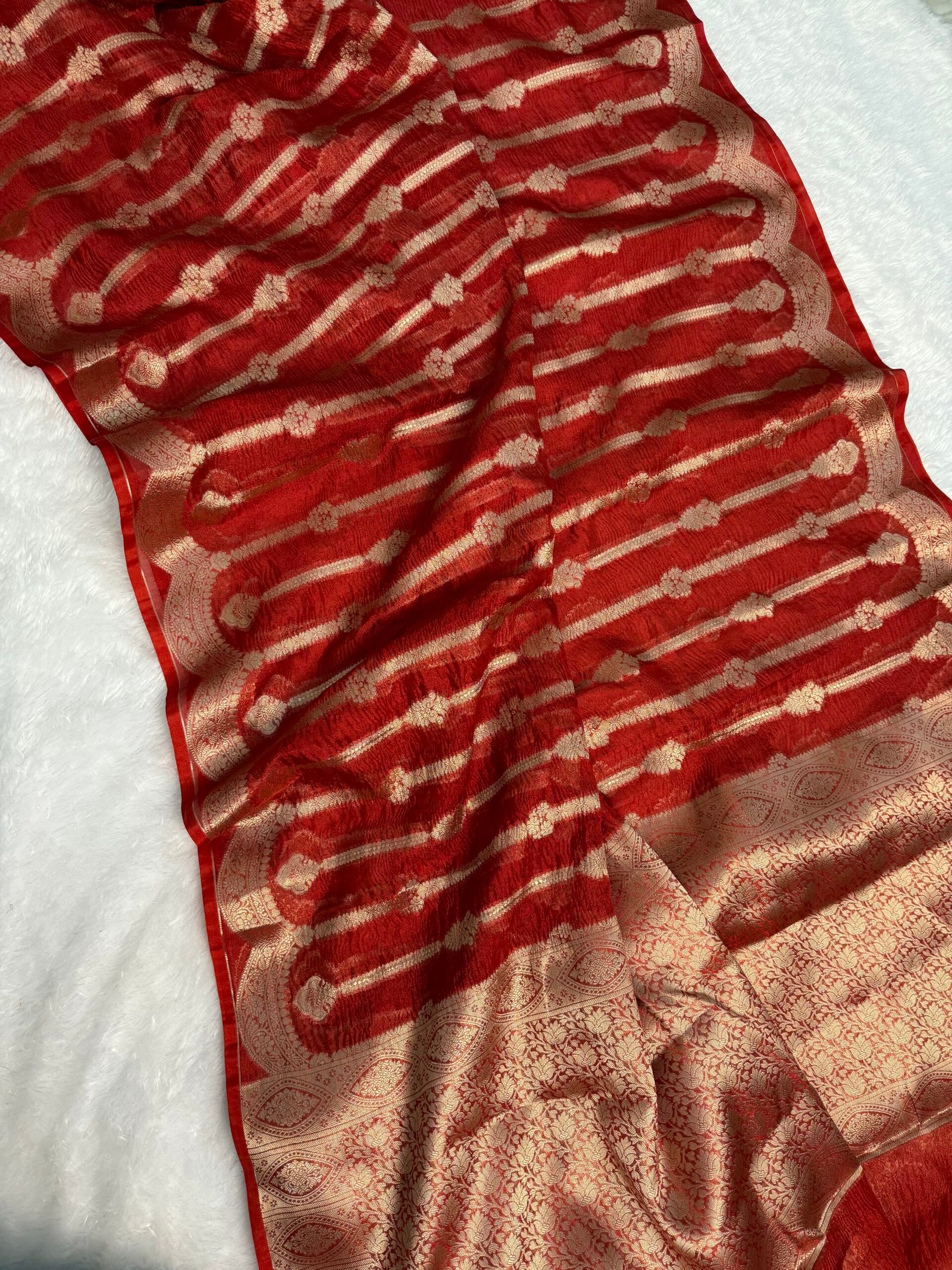 Banarasi tissue crushed saree full body zari weaving strip design beautiful red colour shade with crushed zari weaving Banarasi border rich pallu with brocade blouse pcs