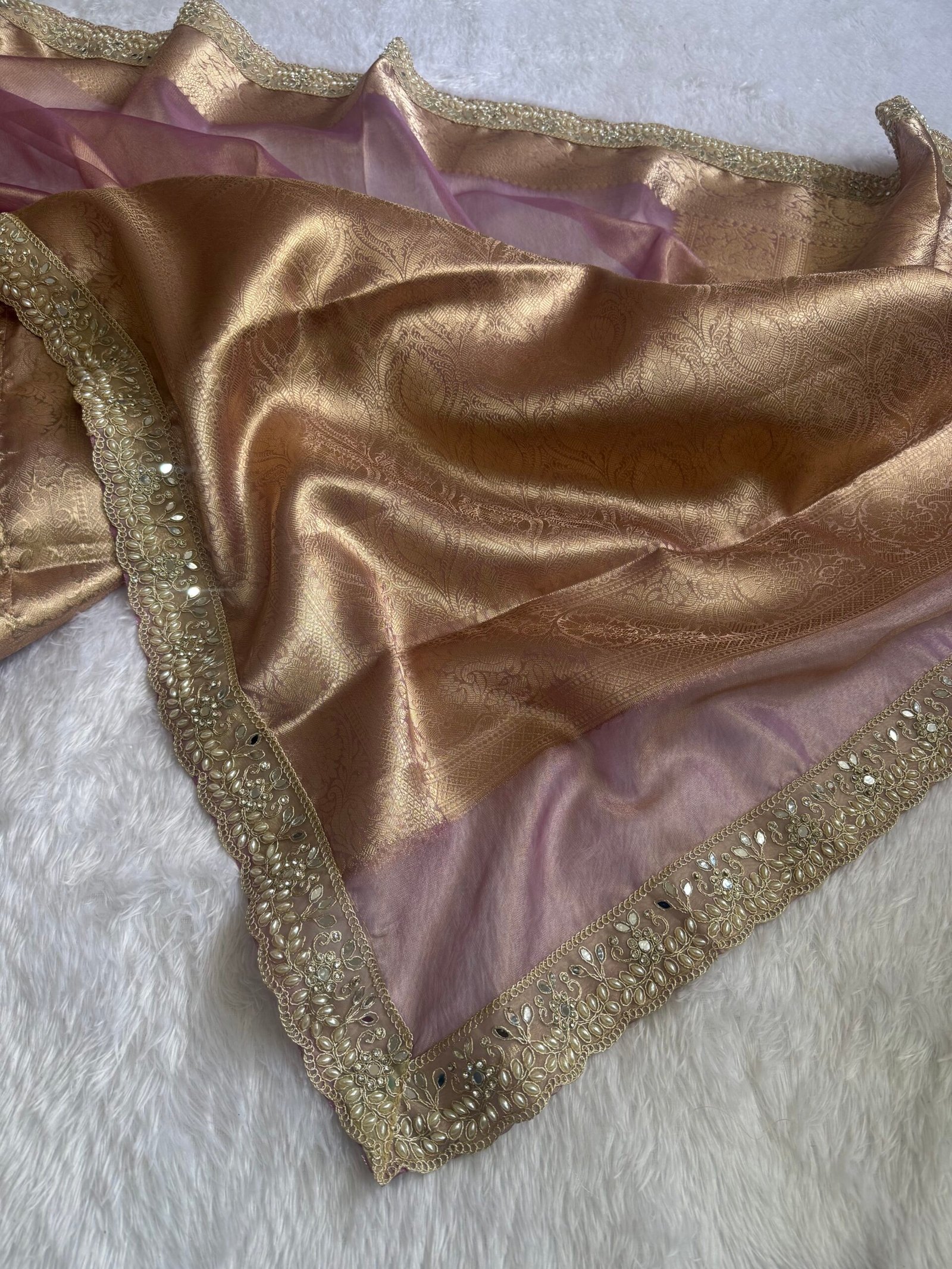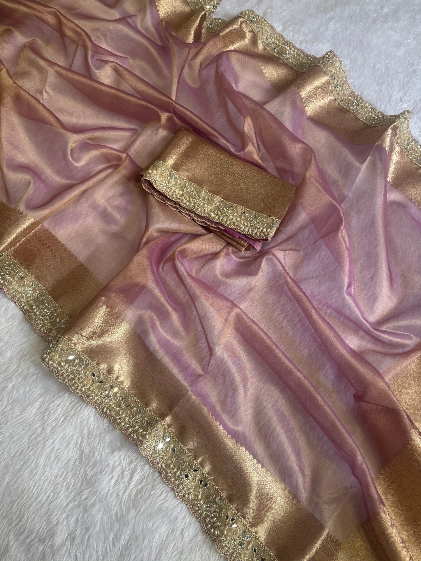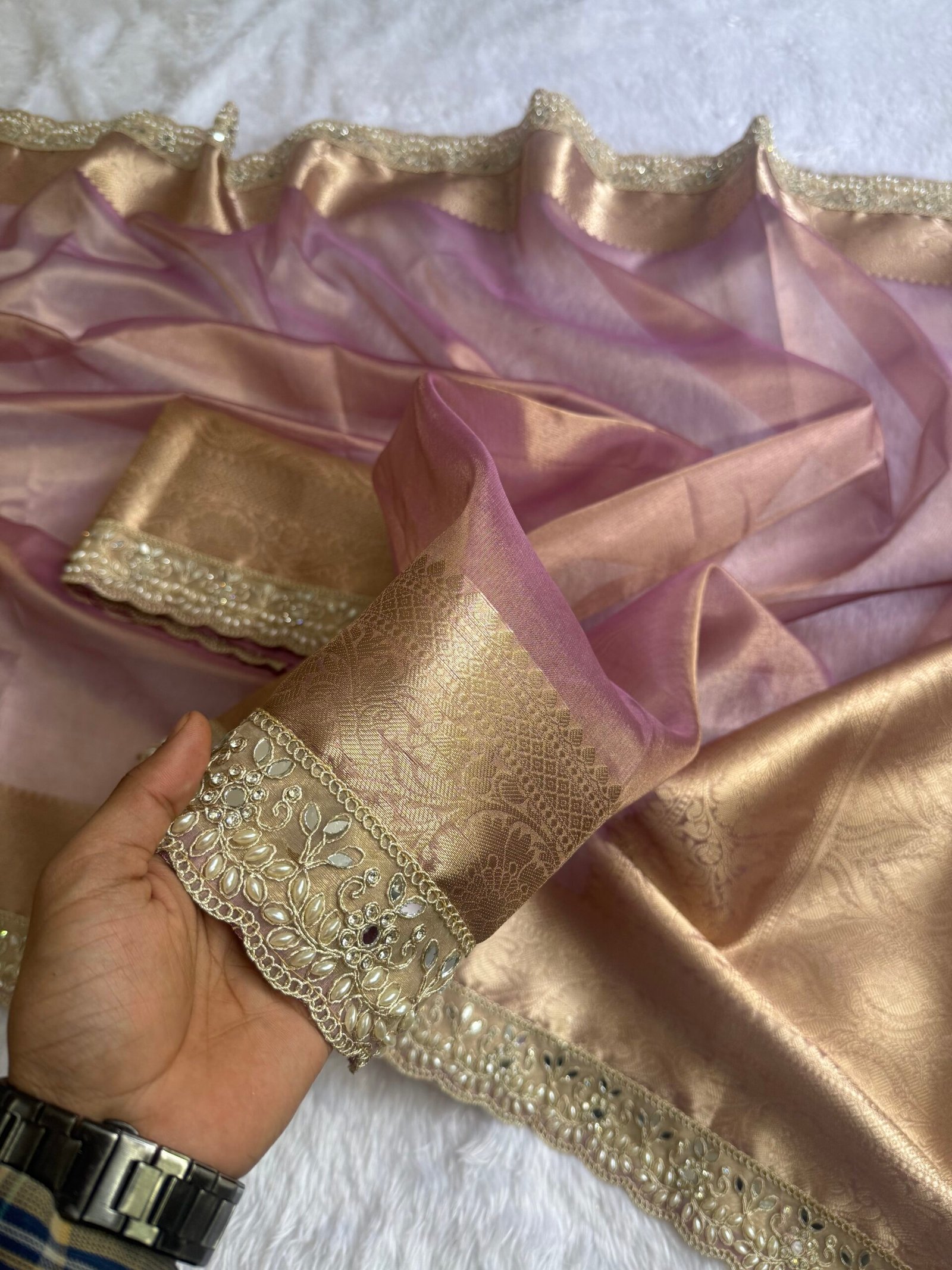 Banarasi soft zari weaving tissue saree with stone lace Beautiful color shade Transparent saree Full body plain with border attached lace Pallu with brocade blouse PCs