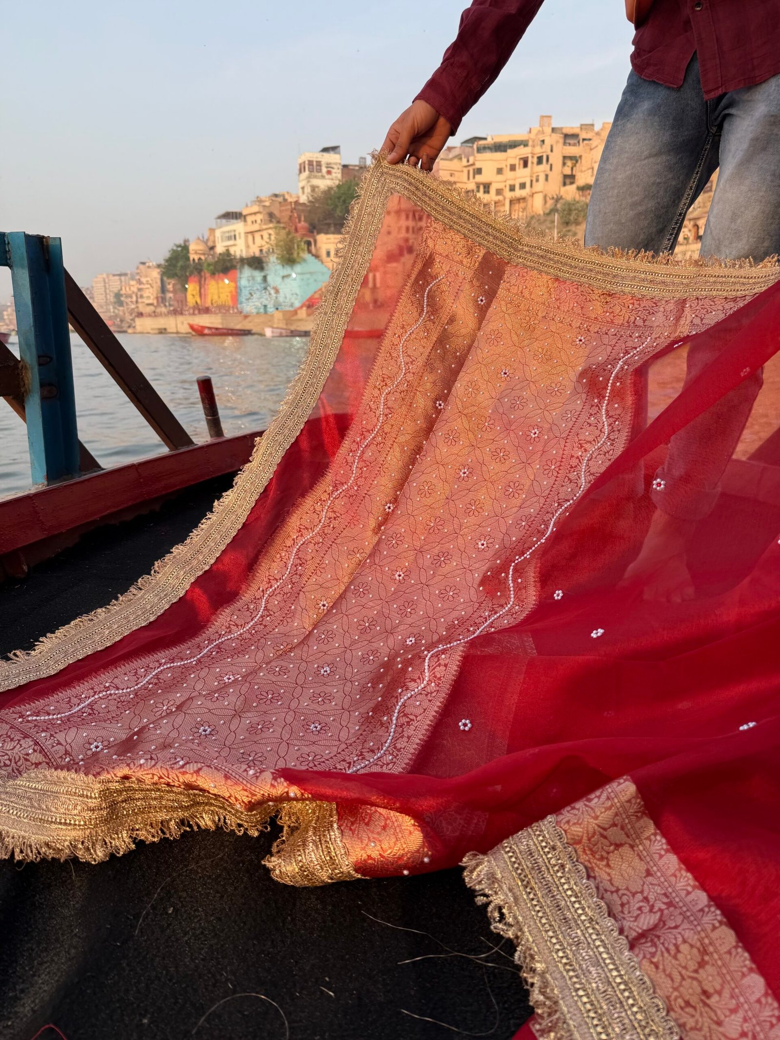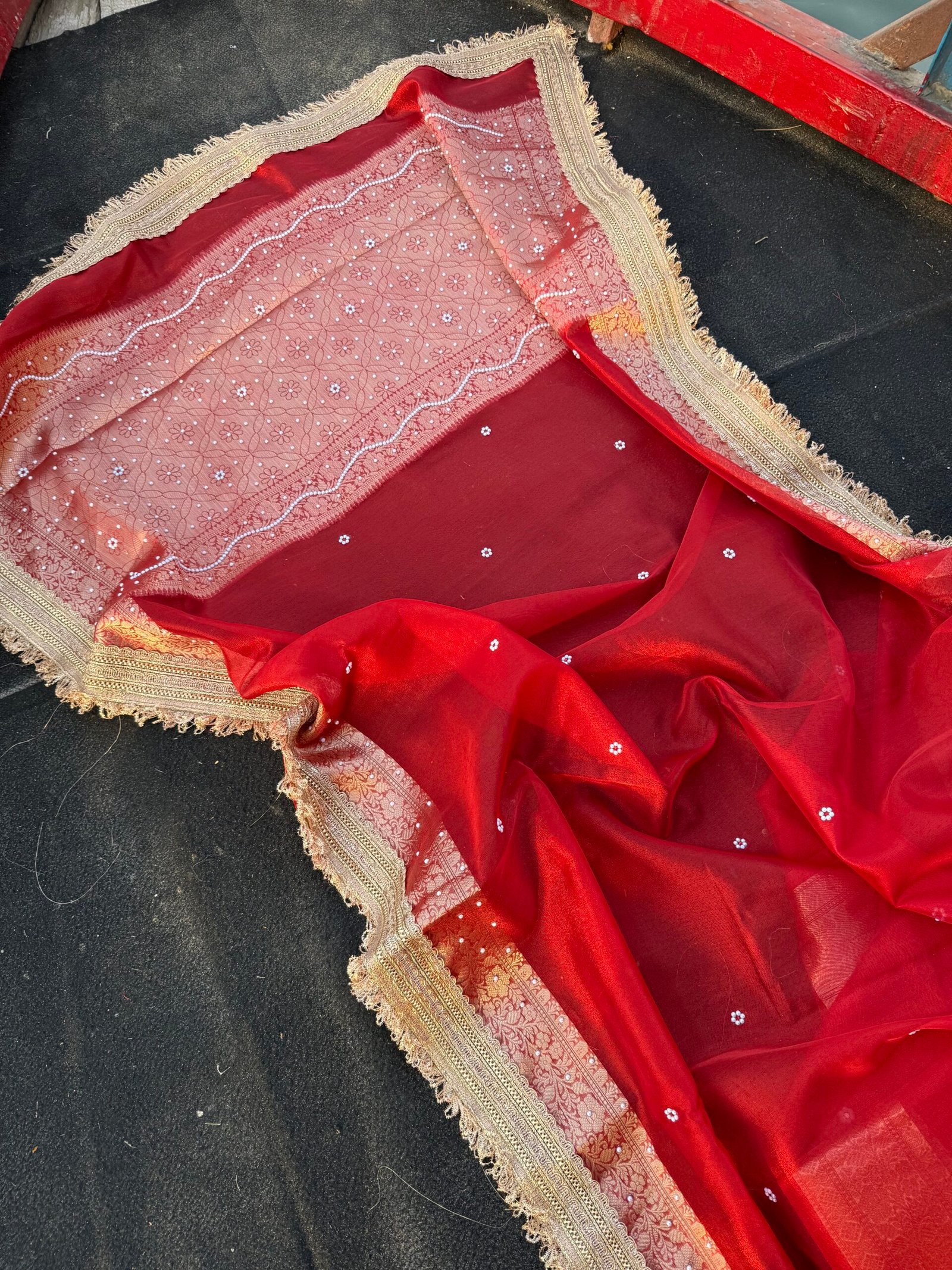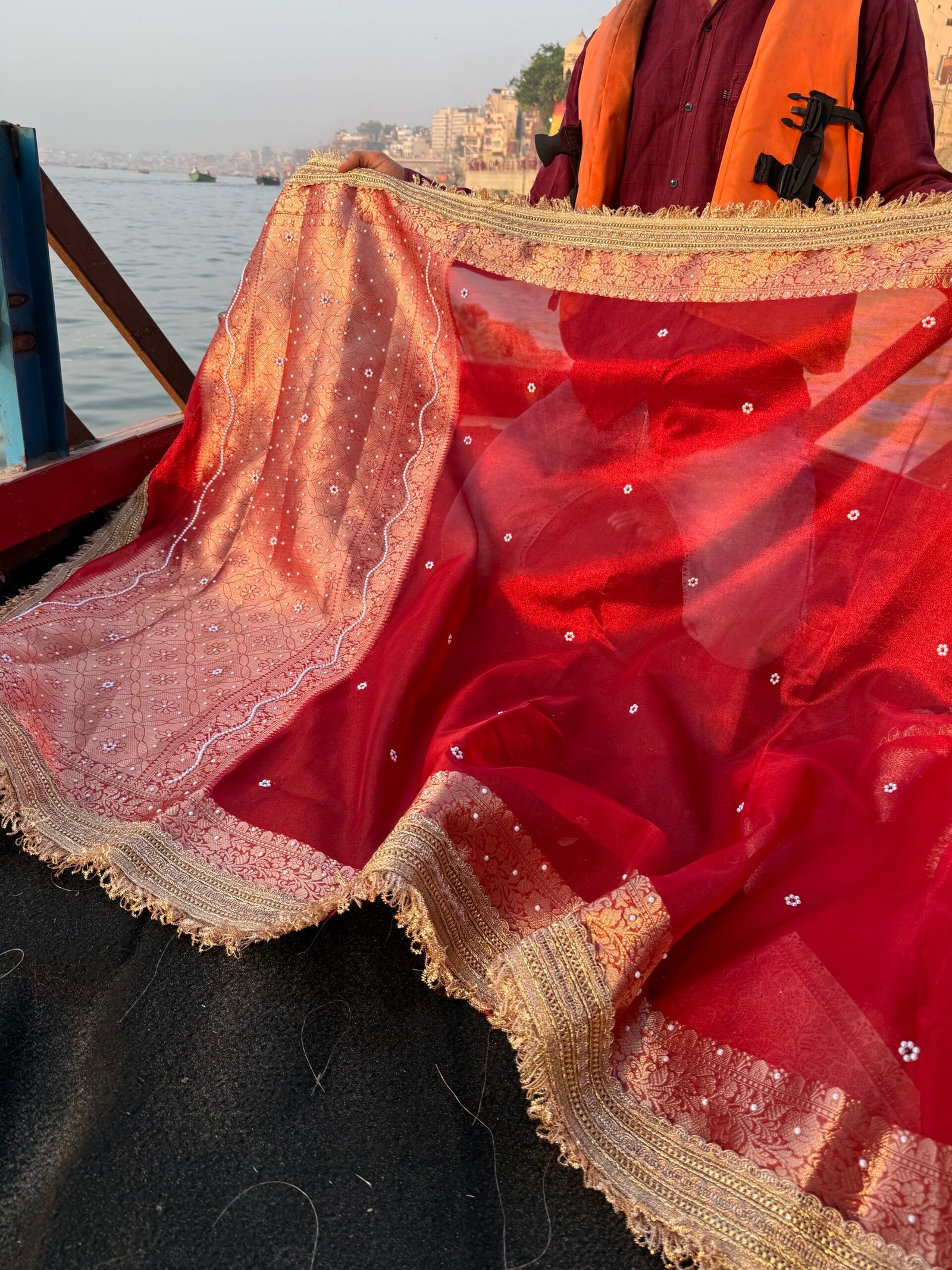 This saree special for wedding Banarasi red tissue saree with stone work zari weaving border attached maharani lace elegant pallu with brocade blouse pcs